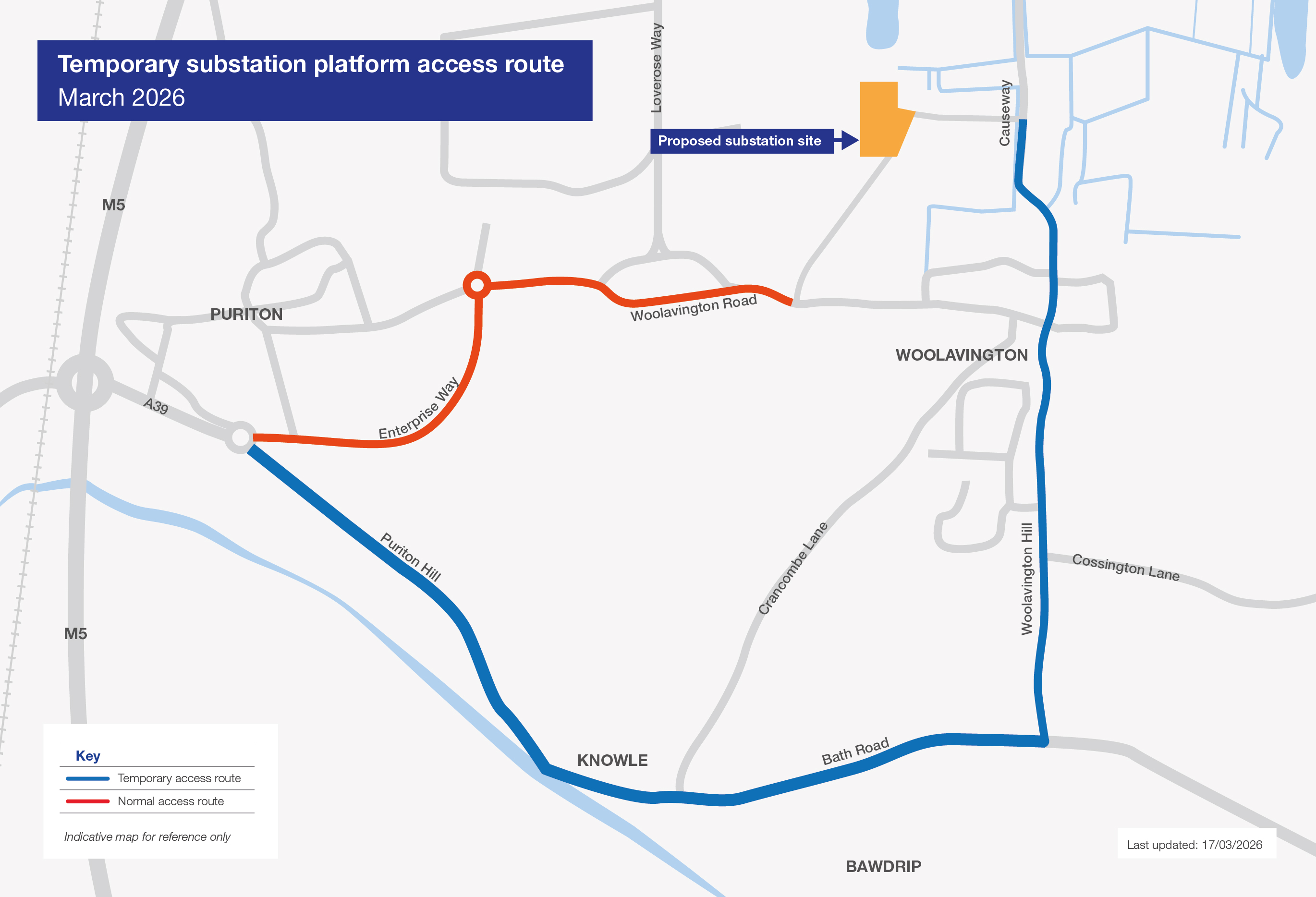 National Grid Electricity Transmission has announced a temporary change to the route used by construction vehicles accessing the substation platform off Woolavington Road. From 19 March, and for approximately three weeks, construction vehicles will use the A39 and B3141.